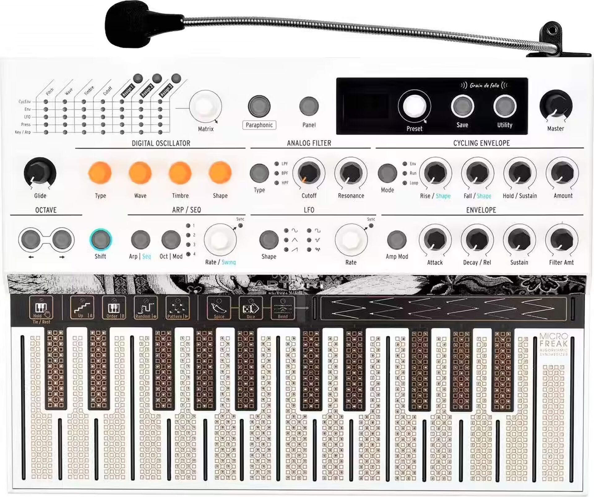 Pour une expérience optimale, Arturia fournit un micro col de cygne spécialement conçu pour le MicroFreak Vocoder. Facile à fixer, il remplace le simple micro casque et permet de tirer pleinement parti des capacités du vocoder, que ce soit en studio ou en live.
