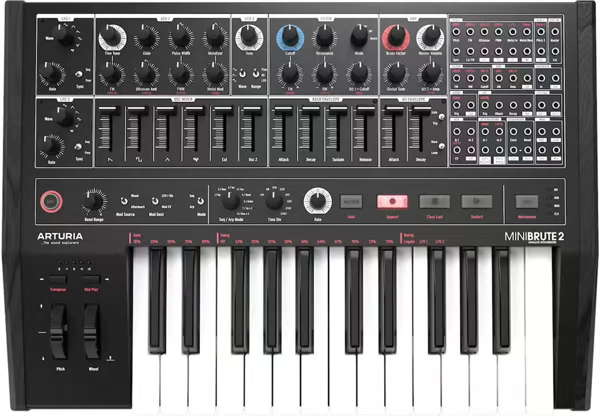 Contrairement aux précédentes versions de la gamme MiniBrute, le MiniBrute 2 ne vous oblige plus à choisir entre séquenceur ou arpégiateur : il intègre les deux, dans des versions plus évoluées.