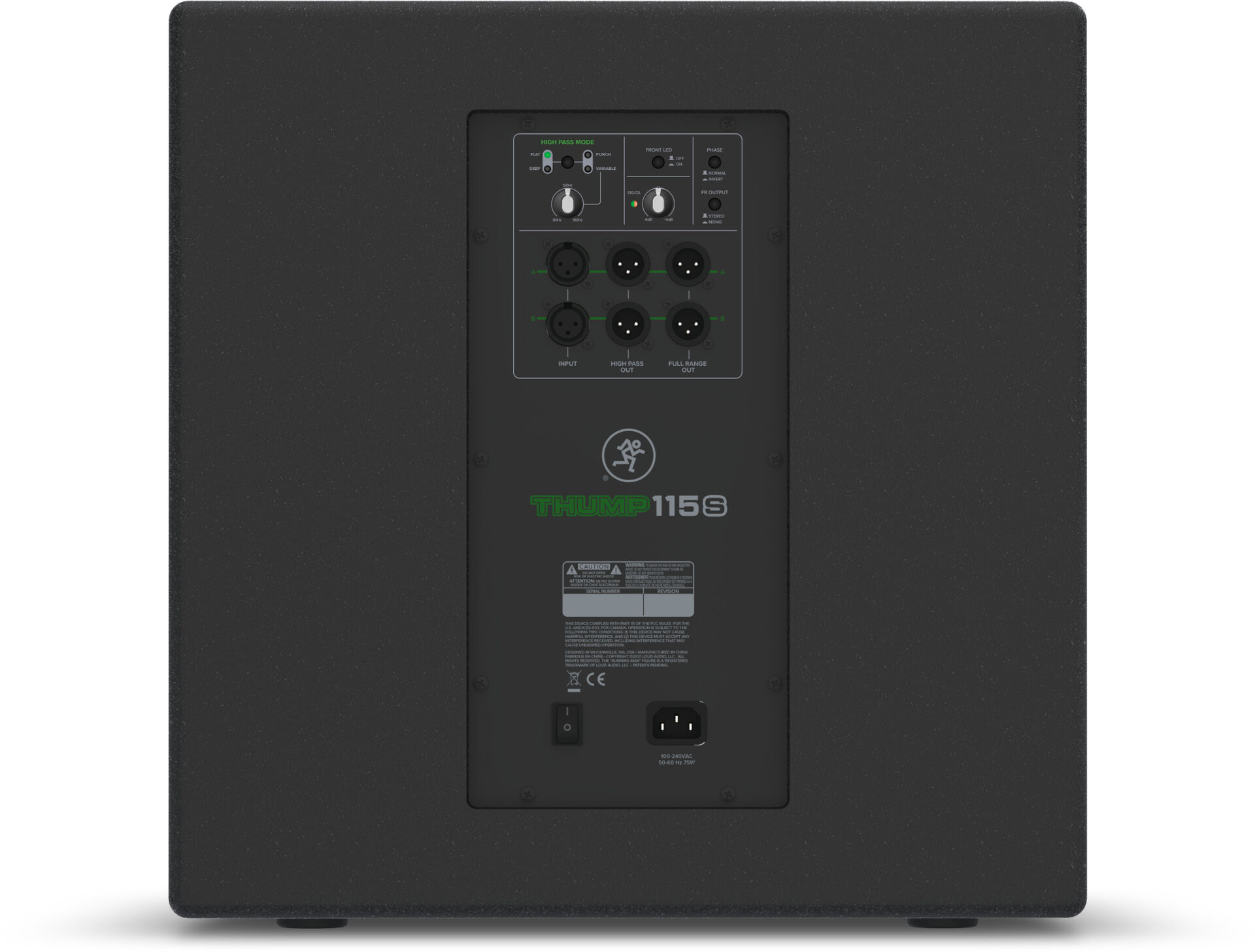 - Contrôles : inverseur de phase, illumination du logo, mono/stéréo, master volume, fréquence de coupure